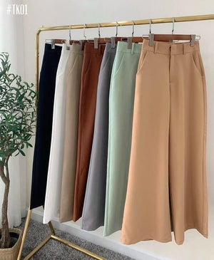 Crafted from a high-quality, breathable fabric, these trousers feature a structured yet soft feel that drapes beautifully across all body types. The high-rise waistband enhances your natural waistline, while the wide-leg silhouette adds fluidity and movement for a flattering, elongating effect.